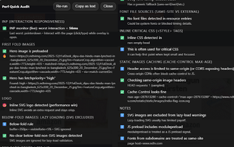 이러한 기능 외에도 Perf Quick Audit에는 사용자 상호작용의 반응성을 실시간으로 추적하는 INP 모니터가 포함되어 있어 사용자 상호작용의 지연을 플래그합니다. 사용자는 감사 결과를 쉽게 복사하여 팀원이나 클라이언트와 공유할 수 있어 협업과 커뮤니케이션을 향상시킵니다. 성능 문제에 대한 신속한 평가를 제공하지만, 이 도구는 Lighthouse와 같은 더 포괄적인 감사 도구를 대체하기 위한 것이 아님을 유의해야 합니다.